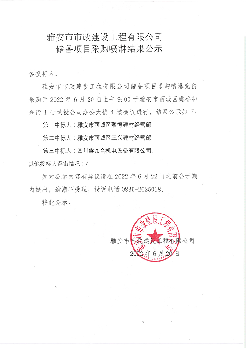 雅安市市政建设工程有限公司储备项目喷淋系统结果公示